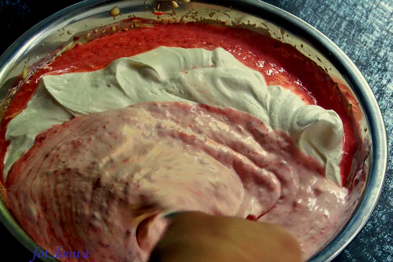 • Śmietankę ubijamy, dodajemy do kremu truskawkowego, mieszamy.