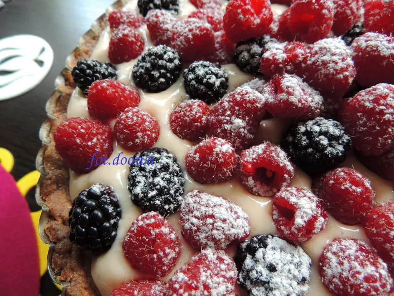 Ja dziś przygotowałam tartę z kremem malinowym i owocami leśnymi.