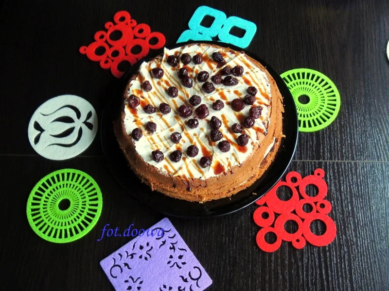 Na wierzchu polałam strużkami syropu i udekorowałam wiśniami z nalewki.