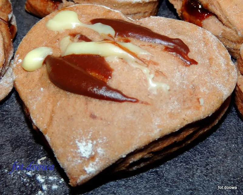 • Teraz z ciasta wykrawałam kółka, na jednym umieściłam porcję powideł, nakryłam kółko drugim krążkiem, lekko docisnęłam i umaczaną w mące foremką - sercem wykroiłam piernik.