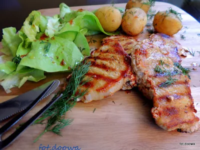 Szybki dressing do sałaty, w tym czasie schab się grilluje i młode ziemniaczki się gotują i mamy to.