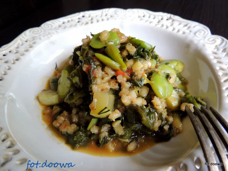 Kaszotto z dodatkiem bobu, pomidorów i szpinaku.