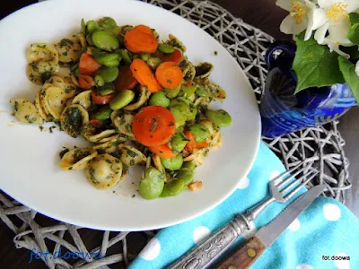 Orecchiette z pesto z natki marchwi i bobem.