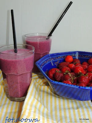 Do kielicha blendera wlałam maślankę, dodałam umyte i oczyszczone z szypułek truskawki a także rozmrożone owoce czarnej porzeczki.