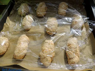 Z każdej części zrobiłam podłużną bułkę, ułożyłam bułki na blaszce wyłożonej papierem do pieczenia i zostawiłam przykryte folią na 2 - 3 godziny aż podrosły.