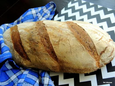 Piekłam chleb przez 30 minut aż chleb się zrumienił a postukany od spodu wydał głuchy dźwięk.