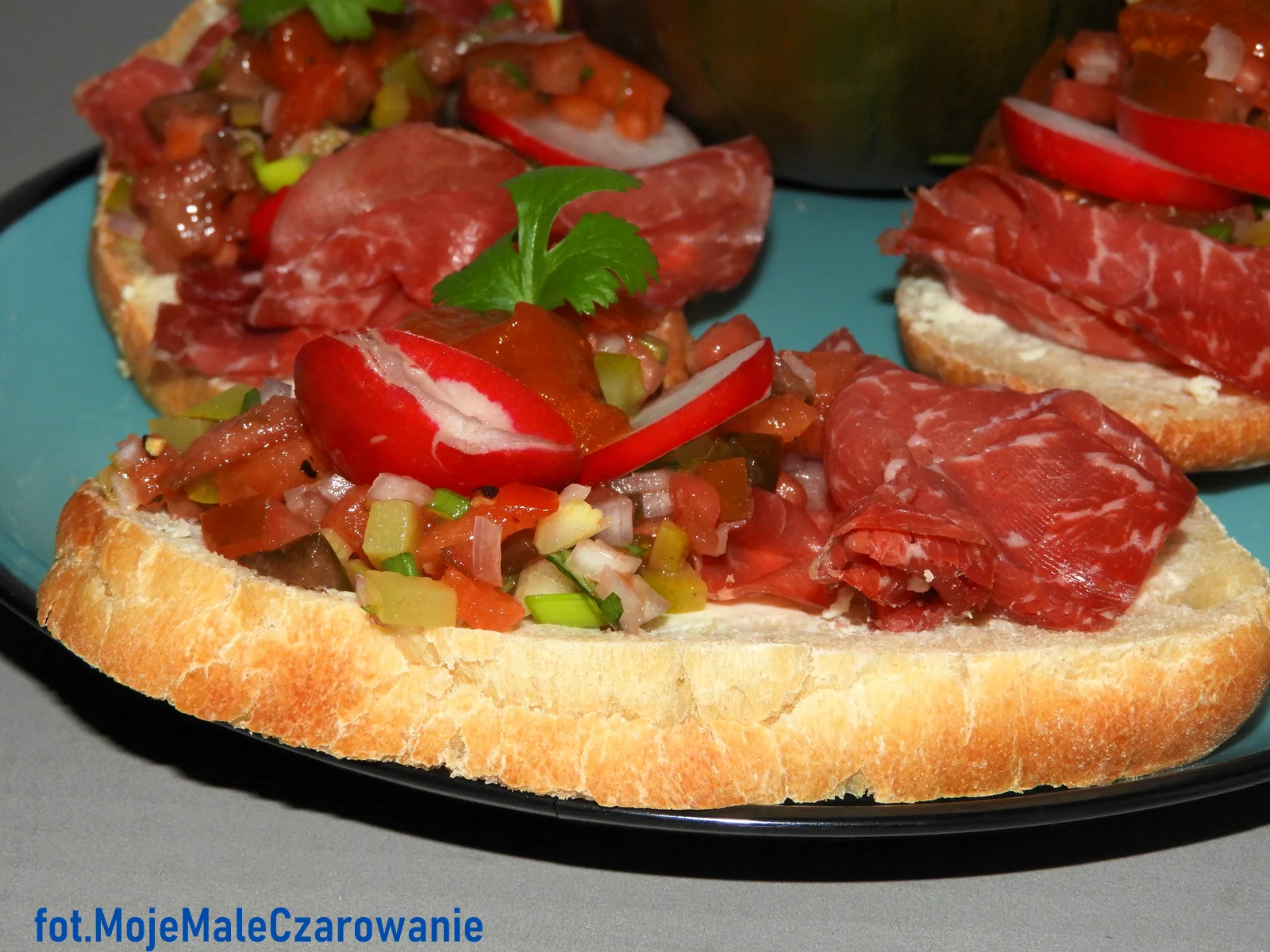 Włoska, wołowa szynka długodojrzewajaca Bresaola i salsa z udziałem czekoladowych pomidorów i rzodkiewki i ajwar a w rezultacie pyszne, pożywne śniadanie.