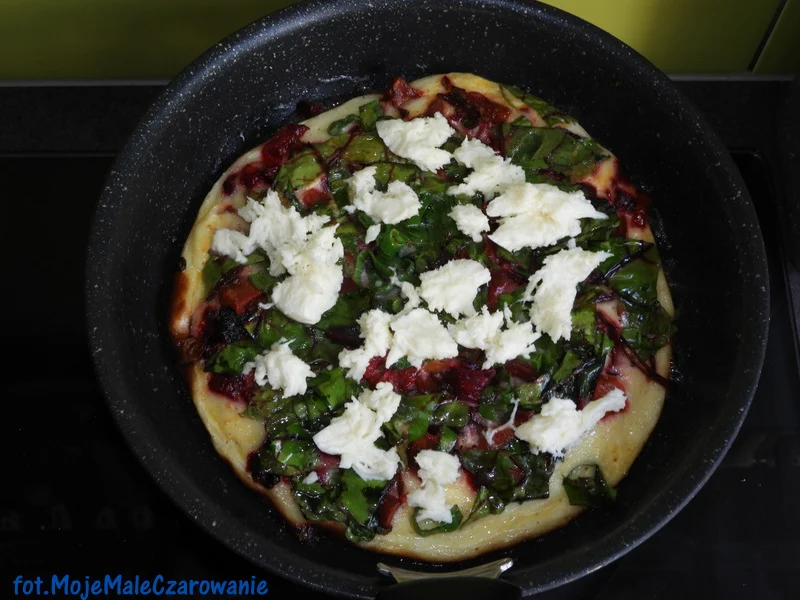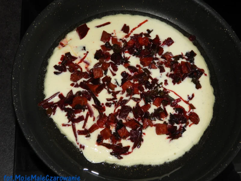 - Teraz posypałam równo ciasto buraczkami i botwiną.